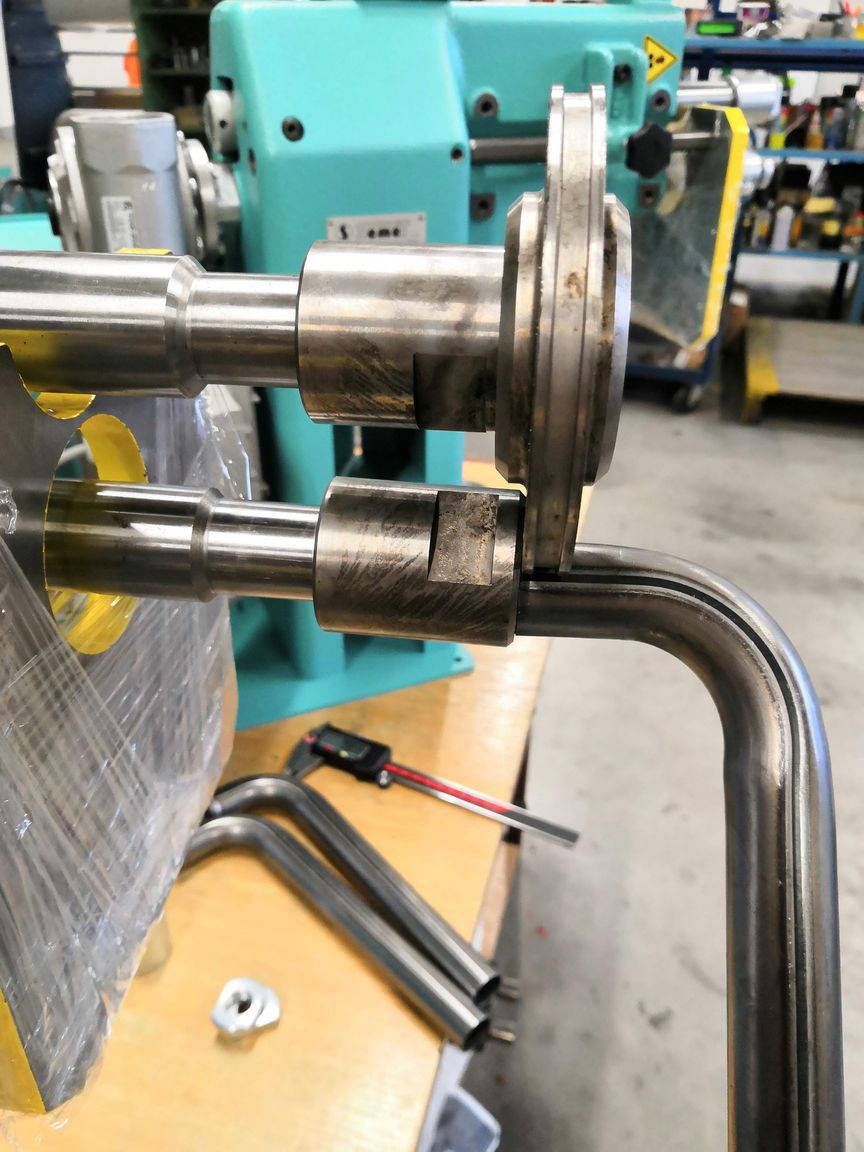 Pro případy, kdy má signovaná trubka opravdu malý průměr, jsme vyvinuli speciální přípravek. Ten se skladá ze dvou nástavců na hřídele, signovacího trnu a tvářecí rolny uložené na ložisku. Materiál je v tomto případě unášen pouze signovacím trnem, a vrchní rolna se volně otáčí společně s ním.